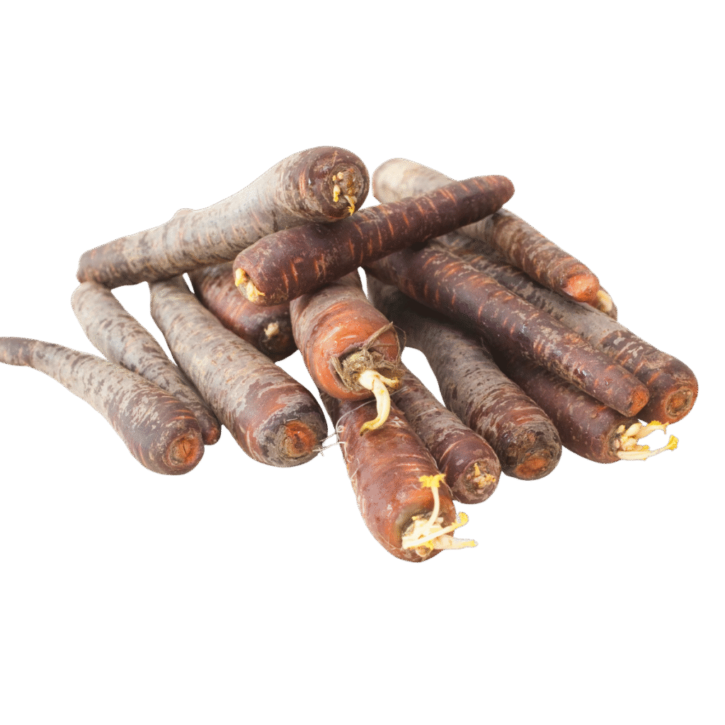 Die Vorfahren unserer Karotten kommen aus dem Vorderen Orient und sie waren tatsächlich schwarz. Die Urkarotte entstand durch Kreuzung der alten schwarzen Karotte mit einer orangefarbenen Karotte. Von außen zeigt sich die Urkarotte violett, innen ist sie orange oder gelb. Die Farbe weist auf einen hohen Anteil an sekundären Pflanzenstoffen hin. Auf dem Teller ist sie ein echtes Highlight! Sie braucht nicht geschält werden, gut abbürsten reicht aus. Zu empfehlen ist, die Urkarotte separat zu kochen, da andere Gemüsearten durch den Urkarottensaft dunkel verfärbt werden.