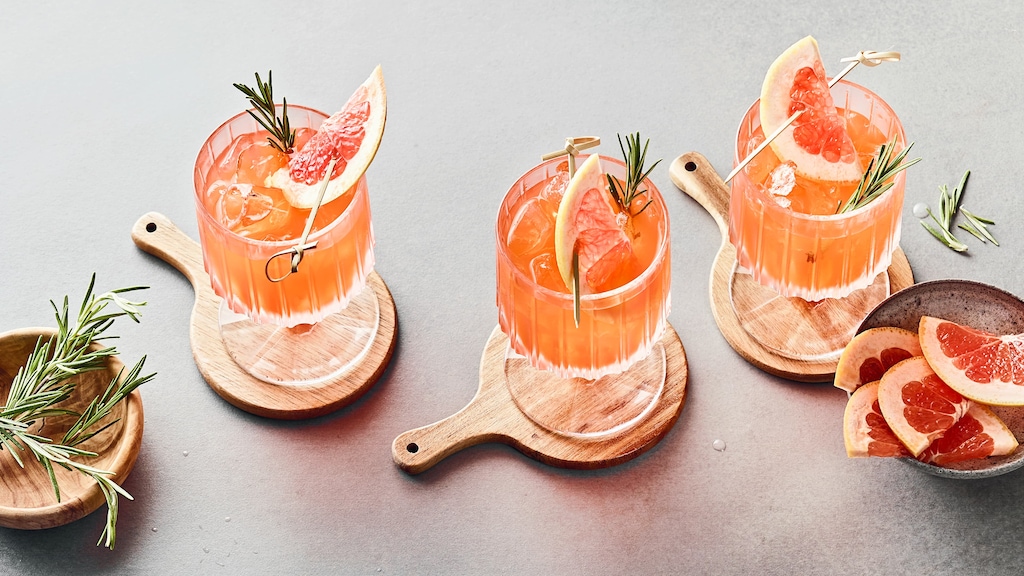Jedes Glas mit drei Eiswürfeln befüllen und den Drink hineingießen. Mit frischen Grapefruitscheiben und Rosmarin garnieren und servieren.