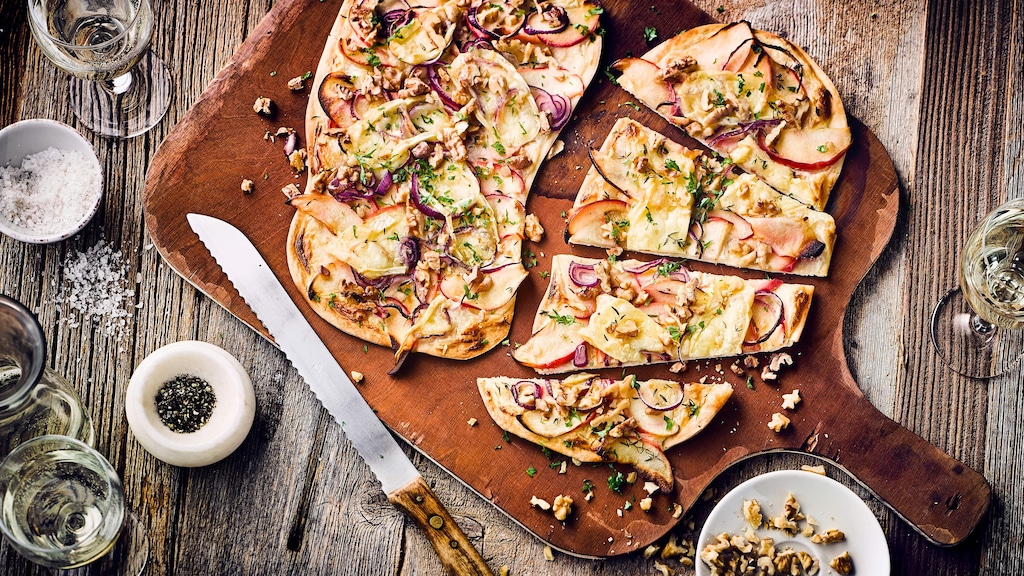 Der original Elsässer Flammkuchen wird mit Speck, Zwiebeln und Schmand mit Crème fraîche belegt. Lecker, aber mit unserem Apfel-Flammkuchen-Rezept lernen Sie eine spannende Variante kennen, die mit Aromen zwischen süß und herzhaft spielt.
