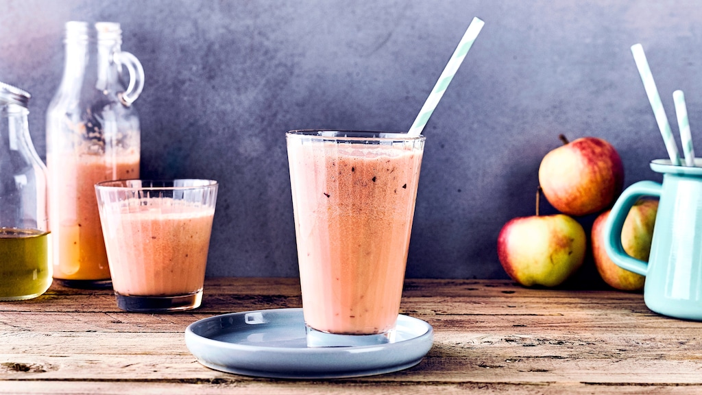 Eine tolle Kombination ist unser gesunder und super leckerer Milch-Shake aus Äpfeln, Milch, Karottensaft und Ahornsirup.
