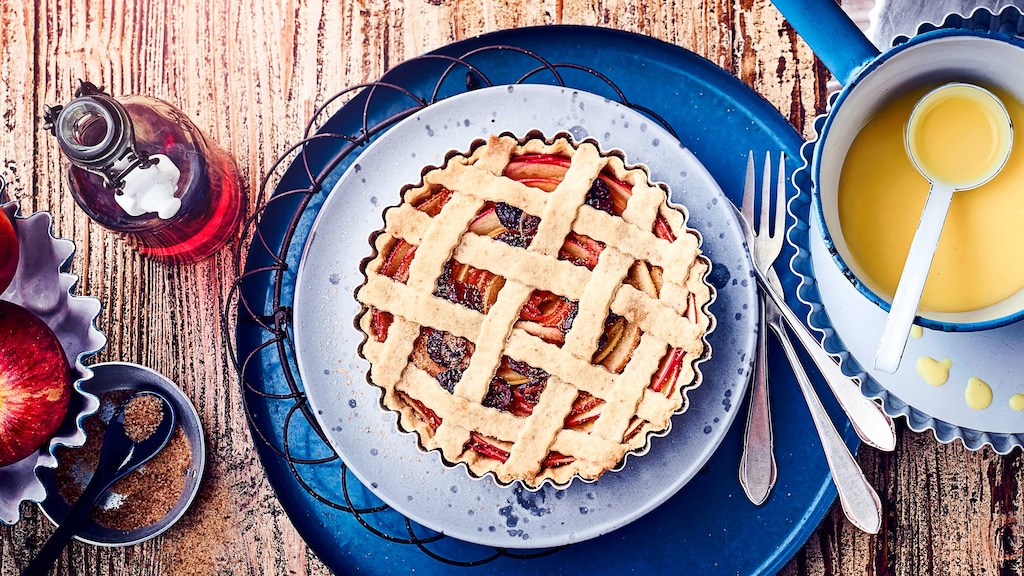 Die Äpfel rosenförmig auf dem Teig anordnen. Für den Teigdeckel den restlichen Mürbeteig in Streifen schneiden und diese im Kreuzmuster über der Tarte verteilen. Die Tarte für abermals 10 Minuten backen.