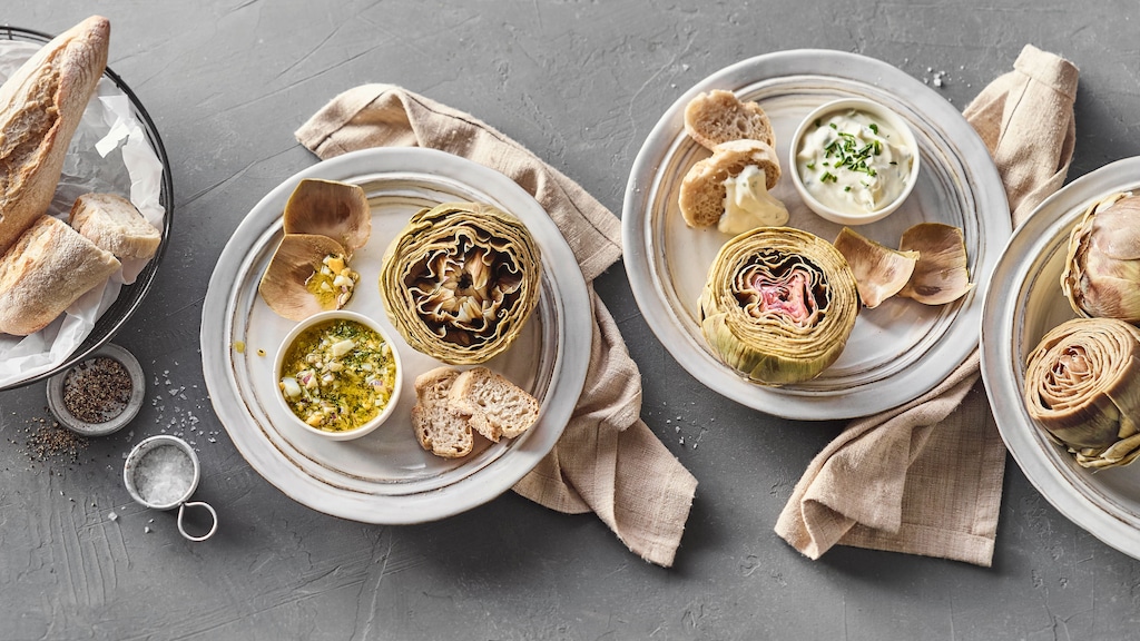 Artischocken gehören zu den Gemüsesorten, die hierzulande nicht ganz so häufig auf dem Tisch landen. Eigentlich schade: Denn ihr leicht herber und nussiger Geschmack mit einer subtilen Süße harmoniert wunderbar mit einer Vielzahl von Gewürzen und Zutaten. Zitronensaft hebt die feinen Aromen der Artischocke hervor, während Knoblauch und Olivenöl sie in mediterranen Gerichten perfekt ergänzen. Kräuter wie Thymian, Rosmarin und Petersilie passen ebenfalls gut zu ihrem Geschmack. Auch mit Parmesan oder anderen harten Käsesorten kommen Artischocken gut zur Geltung. Sie sehen: Ihnen steht eine ganze Palette von Aromen zur Verfügung, mit denen Sie das Gemüse kombinieren können. In diesem Rezept servieren wir die Artischocken mit zwei verschiedenen Dips mit Knoblauch: einem Creme-Dip auf Basis von Joghurt und Crème fraîche, fein abgeschmeckt mit Senf, Zitrone und Schnittlauch. Und einem Dip, für den ein hart gekochtes Ei mit Essig, Öl und Schalotten vermischt wird.