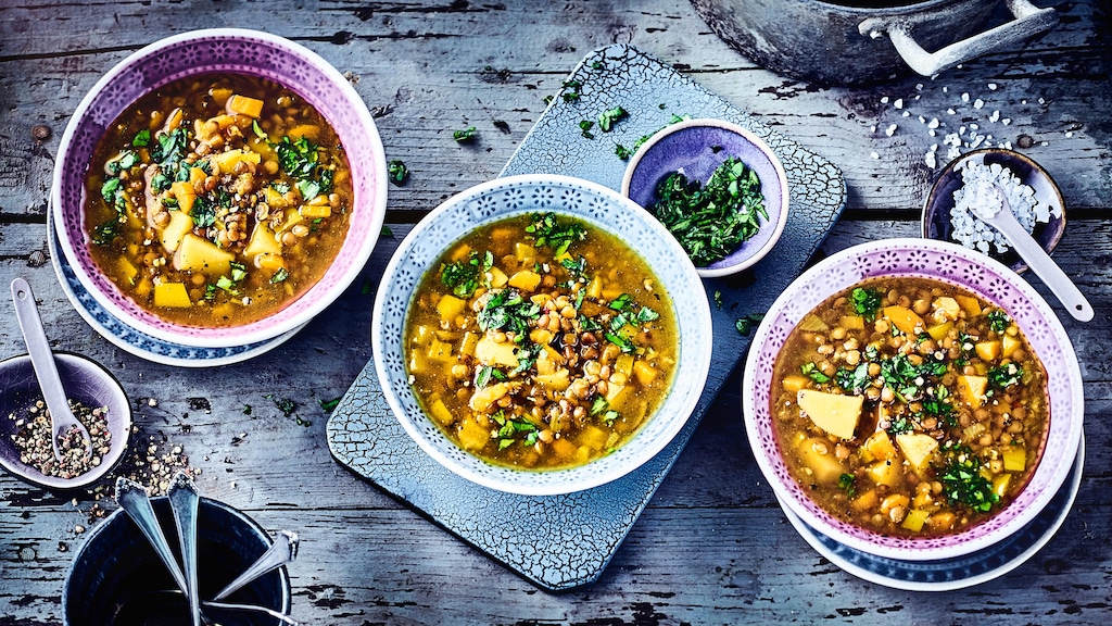 Wie wäre es mit einer veganen Vorspeise mit buntem Gemüse? Probieren Sie unsere asiatische Suppe mit grünen Berglinsen, Karotten, Paprika und Zitronengras – fertig in 45 Minuten!