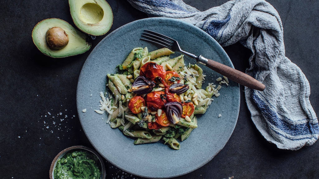 Genießen Sie selbstgemachtes Avocado-Pesto mit Spinat zu Vollkorn-Penne und im Ofen gebackenen Tomaten!
