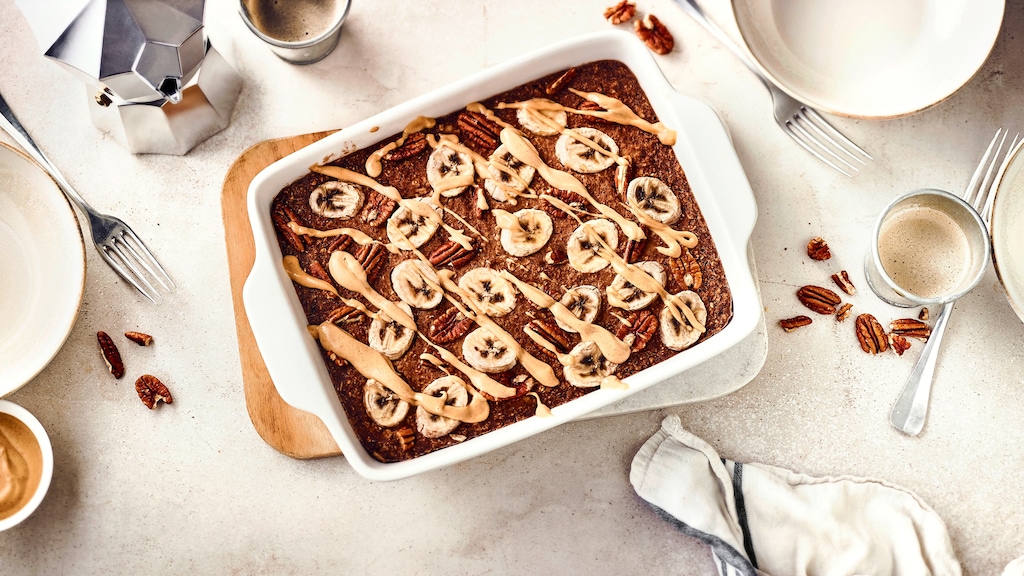 Für diesen Start in den Tag benötigen Sie rund 20 Minuten Zubereitungszeit und weitere 30 Minuten, um die Masse im Ofen zu backen. Die Mühe wird mit einem warmen, energiereichen Frühstück belohnt, das lecker schmeckt und dabei gesund ist. Zimt, Pekannuss und Kakao sorgen für einen aromatisch-süßen Geschmack, der durch die reifen Bananen abgerundet wird. Und apropos Bananen: Zaubern Sie aus übrig gebliebenen Früchten unbedingt einmal unseren klebrig-süßen Banoffee Pie. So lecker!