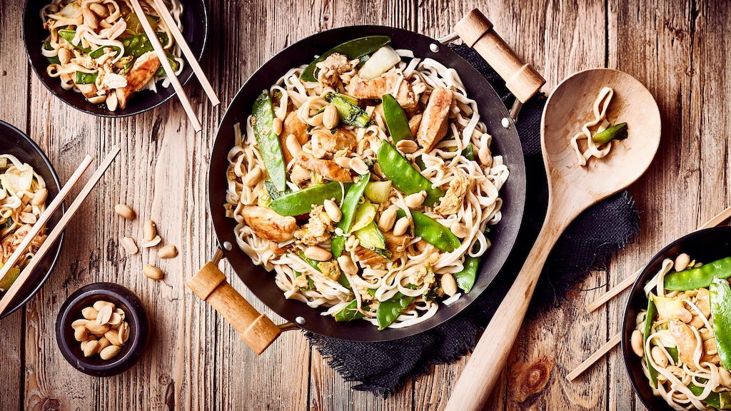 Das indonesische Pfannengericht kommt traditionell ohne frische Bami-Goreng-Gewürze oder Kräuter aus: Den typischen Geschmack erzielt das Rezept vielmehr durch die Würzsauce, die Sie verwenden. Hier haben Sie die Qual der Wahl: Wir nehmen für unser Rezept scharfes Sambal Oelek, in den indonesischen Straßenküchen kommen aber auch Ketjap Manis – eine süßliche Sojasauce –, Ketjap Asin – ihre pikante Schwester – oder Sambal Manis – eine Paste aus gebackenem spanischem Pfeffer – zum Einsatz. Apropos Straßenküchen: Ein weiterer Hit dort ist der beliebte Snack Gado Gado, den Sie nach unserem Rezept ebenfalls leicht selber zubereiten können. Und von Indonesien ist der Sprung in die thailändische Küche auch nicht mehr sehr weit – hin beispielsweise zu dem ebenfalls in der ganzen Welt beliebten Nudelgericht Phad Thai.