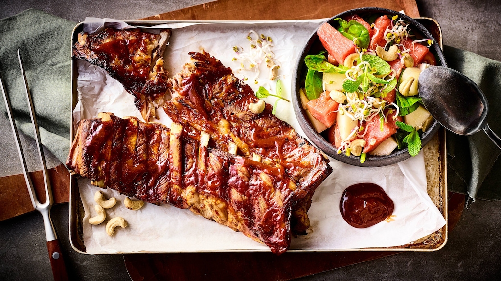 Leckere Rippchen in BBQ Sauce, ideal vom Grill oder aus dem Ofen, und dazu ein frischer Melonensalat mit Spinat und Cashewkernen.