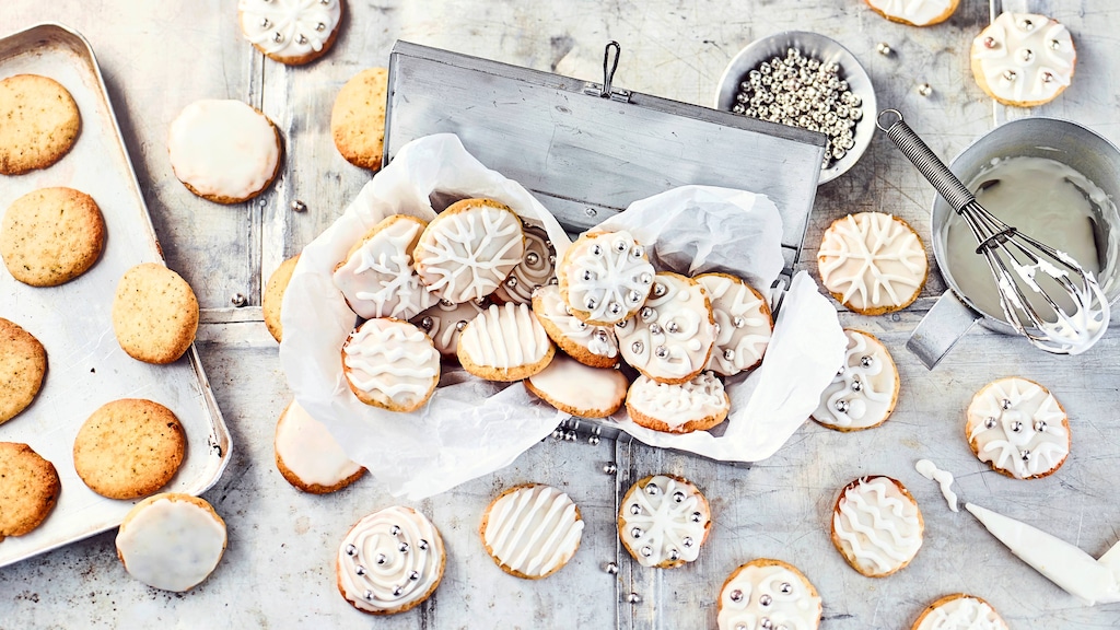 4 EL Limettensaft und 130 g Puderzucker zu einem Guss verrühren. Kekse mit der Oberseite hineintauchen. Restlichen Puderzucker unter den Guss rühren und in einen Spritzbeutel mit kleinster Lochtülle füllen. Nach Belieben Muster auf die Plätzchen spritzen und mit Silberperlen verzieren. Trocknen lassen. Kühl in einer Keksdose aufbewahren.