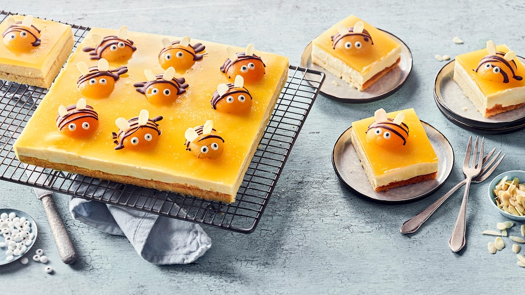Drei Schichten hat unser Bienen-Kuchen. Ein wenig Zeit müssen Sie also mitbringen. Großes Vorwissen dagegen nicht. Alles beginnt mit einem Rührteig. Maximal simpel, gleichzeitig unglaublich lecker. Für die Creme mischen Sie Quark und Schmand mit Vanillepudding, ehe Sie den Fruchtspiegel anrühren. Perfekt ist dabei nicht nur das Zusammenspiel aus unterschiedlichen Konsistenzen, auch die Aromen harmonieren hervorragend. So ergänzt die leichte Säure der Maracuja die intensive Pfirsich-Süße optimal. Auch Vanille fügt sich harmonisch ein. Perfekt wird das Genusserlebnis durch die Mischung aus luftigem Teig und cremigem Topping. Es passt einfach. Wie übrigens auch bei unseren anderen Ideen zum Backen mit Kindern. Um die gesamte Feier kulinarisch optimal zu begleiten, empfehlen wir außerdem unsere Kindergeburtstag-Rezepte.
