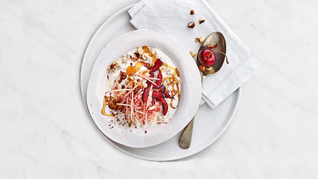 In Vanillemilch eingelegte Haferflocken, frische Kirschen, geröstete Haselnüsse, gehobelter Apfel, eine Prise Zimt, Honig und ein üppiger Klecks Sahne: Eine Schüssel unseres köstlichen Birchermüslis mit Apfel hat es in sich und versammelt gleich mehrere wertvolle Zutaten.
