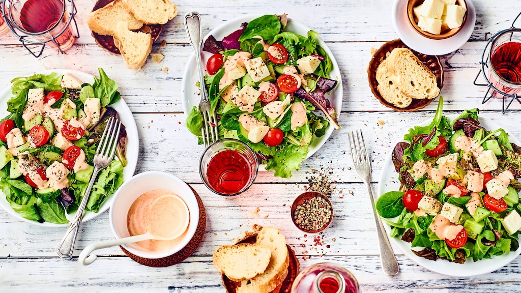 Schnelles Gericht für Zwischendurch oder als Vorspeise: Probieren Sie unseren Blattsalat mit Gurkenstückchen und Mozzarella an Joghurt-Dressing!