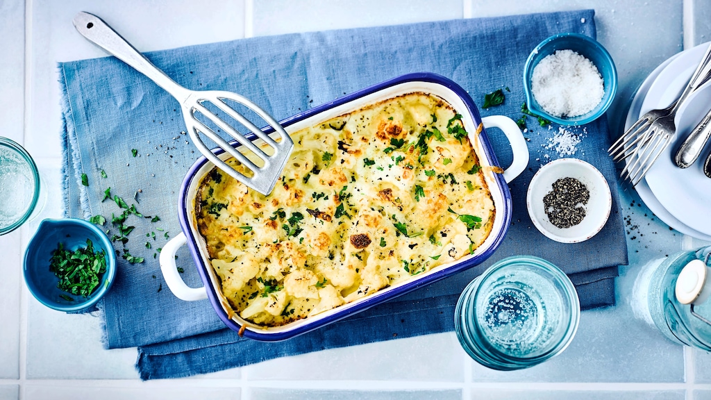 Auch dank seiner Vielseitigkeit zählt Blumenkohl zu Deutschlands beliebtesten Gemüsesorten. Sie können ihn zu Suppen, einer veganen Blumenkohl-Bolognese und Pfannengerichten verarbeiten oder bissfest gekocht zu einem Blumenkohlsalat verarbeiten. In der Low-Carb-Küche ist er beliebt, weil er durch den hohen Ballaststoffgehalt lange satt macht – davon profitiert auch unser Blumenkohl-Gratin-Rezept. Dessen Grundlage bildet ein selbst gemachter Fond. Dazu kommen Sahne, Milch und Mehl. Daraus bereiten Sie eine cremige Blumenkohlsoße zu, die das Aroma der Röschen unterstreicht. Zum Überbacken nehmen Sie würzigen Appenzeller. Entsprechend fällt unser Blumenkohlauflauf nicht gerade in die Kategorie „gesund“ und kalorienarm. Die Nährstoffe der Röschen machen Sie sich trotzdem zunutze – und verwenden dabei die in Deutschland gängige weiße Variante. In Frankreich und Italien, den Ursprungsländern des Kohls, werden auch grüne oder violette Sorten verarbeitet.