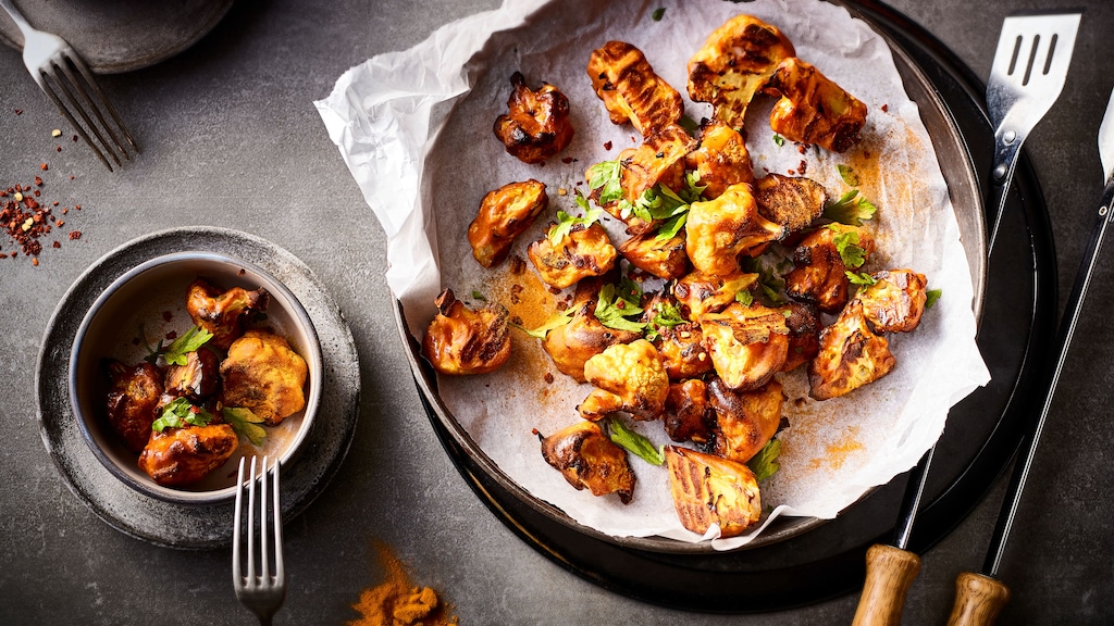 In Röschen zerteilt und braun-kross gegrillt, ähneln unsere Blumenkohl-Nuggets den pikanten Geflügelteilchen optisch und geschmacklich. Sie werden in einer selbst gemachten Marinade aus Mandelmilch, Mehl, Knoblauch-, Zwiebel- und Chilipulver, Kurkuma, Tomatenmark und Agavendicksaft gewälzt, ehe sie auf den Grill kommen. Außerhalb der Saison können Sie Ihren Backofen benutzen – sofern vorhanden, am besten mit Grillfunktion. Um die vegetarischen Wings vorzubereiten, benötigen Sie nur 15 Minuten. Für das Backen oder Grillen circa eine weitere Viertelstunde. PS: Unsere Blumenkohl-Wings sind low carb – sie bringen pro Portion nur 132 kcal und rund 25 g Kohlenhydrate mit.