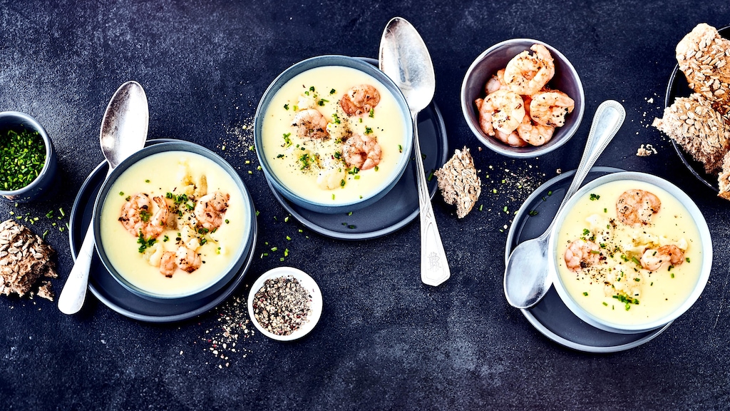 Blumenkohlsuppe einfach selber kochen. Es ist viel leichter, als Sie vielleicht denken. Nutzen Sie unser Rezept, bereiten Sie nicht nur eine cremige Gemüsesuppe zu, vor allem verleihen Sie ihr mit Muskatnuss einen raffinierten Dreh und verfeinern sie mit aromatischen Garnelen.