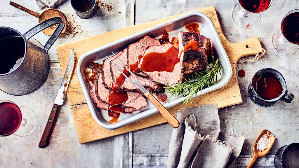 Den Braten aus dem Ofen nehmen und warm stellen. Lorbeerblatt, Rosmarin und die Knochen aus der Sauce entfernen. Die Sauce noch einmal aufkochen, mit dem Soßenbinder leicht binden, mit Salz und Pfeffer würzen. Wie Sie ganz einfach Bratensoße in 3 Varianten selber machen können, zeigen wir Ihnen in unserem „Gewusst wie!“-Video.