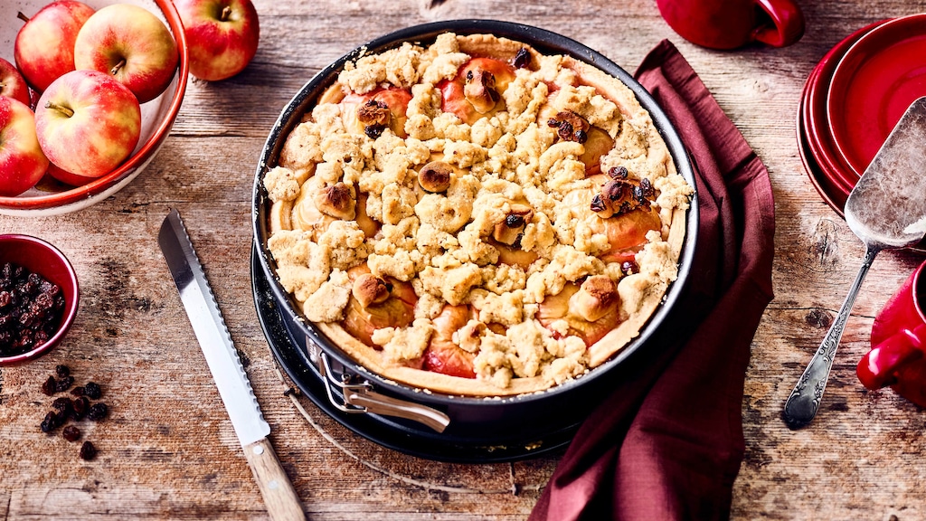 Apfelkuchen mit Streuseln zählt zu den absoluten Klassikern: Der saftige Obstkuchen ist beliebt und gelingt mit den richtigen Handgriffen in kürzester Zeit. Das Rezept ist wandelbar und international – so gibt es ihn auch als Apfelkuchen mit Pudding, als französische Tarte Tatin mit Butterkaramell oder als schwedischen Apfelkuchen mit Zimt und Zucker. Etwas aufwändiger, aber dafür umso weihnachtlicher ist unser Rezept für Bratapfelkuchen – das sich deshalb auch wunderbar als Abschluss Ihres vegetarischen Weihnachtsmenüs eignet. Hier werden die ganzen Äpfel gekocht und anschließend mit Sultaninen und Marzipan gefüllt. Alternativ können Sie die süßen Früchte – wie bei unserem Bratapfel-Rezept – im Ofen backen. Unser Tipp: Wer keine Rosinen als Füllung mag, kann bei diesem Rezept auf einen Mix aus Getreideflocken und Gewürzen zurückgreifen. Auch eine Mischung aus gemahlenen Nüssen und aromatischer Johannisbeer-Marmelade passt hervorragend dazu. Wenn Sie kulinarisch gerne Neues ausprobieren und etwas Raffiniertes suchen, können Sie die Äpfel zum Beispiel mit Schokoladenstückchen oder Marshmallows füllen.