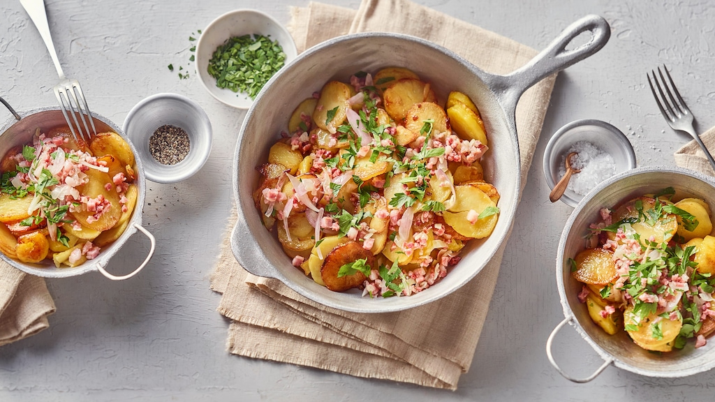 Sie sind eine typisch deutsche Spezialität, passen als Beilage zu Fisch sowie Fleisch und lassen sich einfach zubereiten: unsere Bratkartoffeln mit Speck und Zwiebeln.