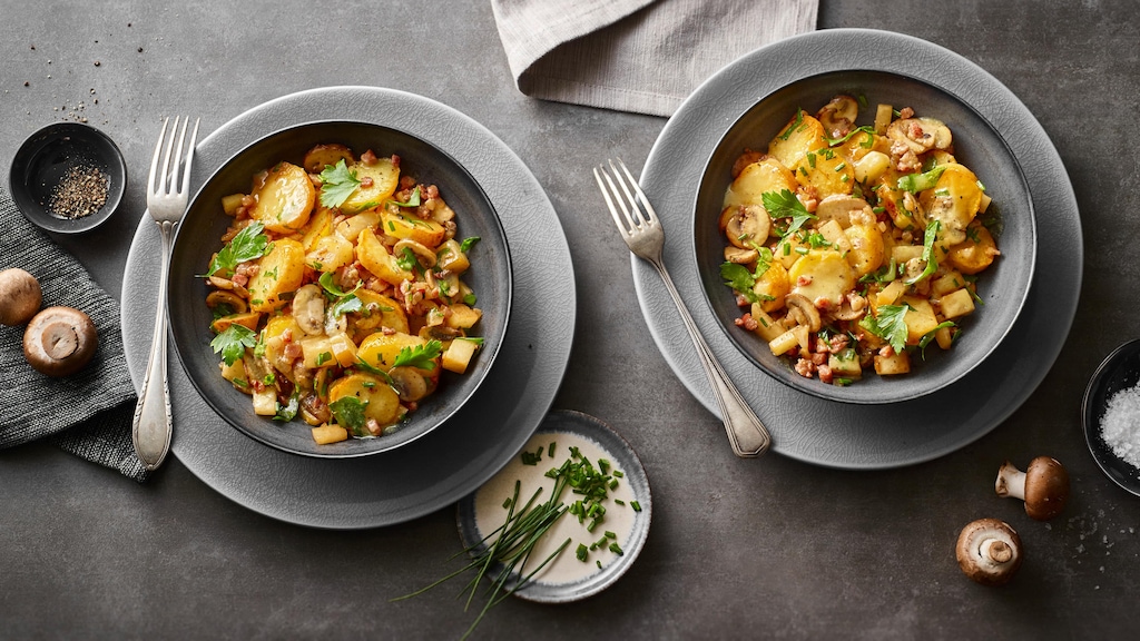 Bratkartoffeln sind eine beliebte Beilage zu Fleisch & Co. Sie schmecken jedoch auch als Hauptzutat in einem leckeren Bratkartoffelsalat. Zusammen mit Champions, Schinkenwürfeln, Kohlrabi und Zwiebeln kommen die Kartoffeln besonders gut zur Geltung. Gleich ausprobieren!