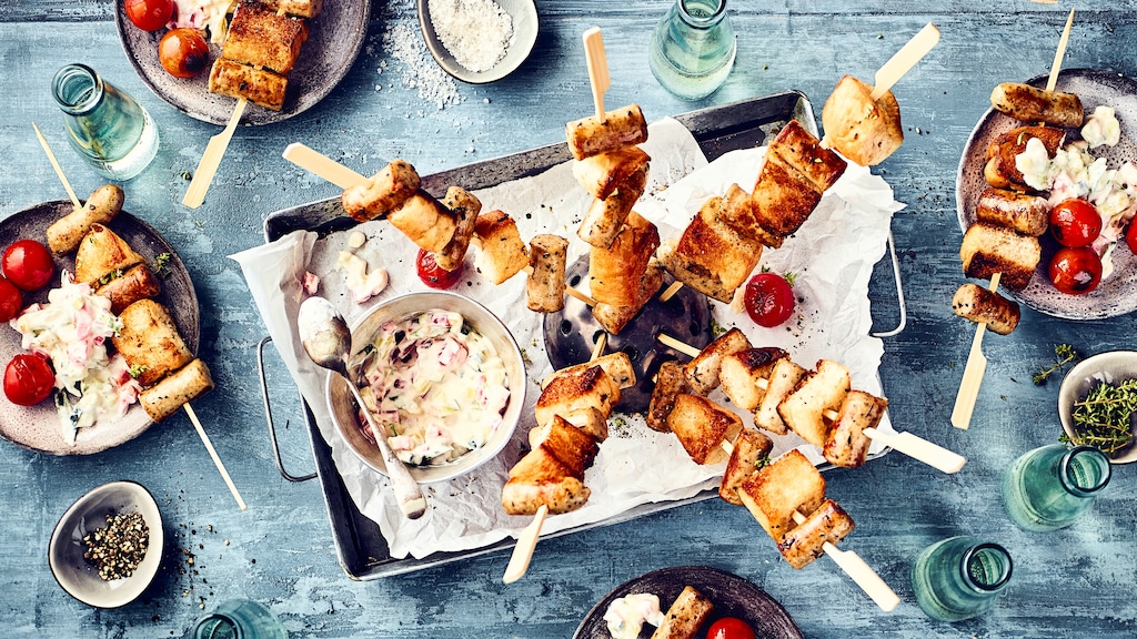 Sommerliche Spieße zum Grillen mit Bratwürstchen und Fladenbrot. Dazu einen selbstgemachten Sauerrahm-Dip.
