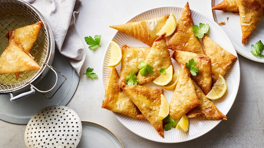 Öl in eine tiefe Pfanne oder einen Topf geben und auf 180 Grad erhitzen. Die Teig-Dreiecke vorsichtig in das heiße Öl geben und von beiden Seiten goldbraun frittieren. Mit einer Schaumkelle entnehmen und auf Küchenpapier abtropfen lassen.