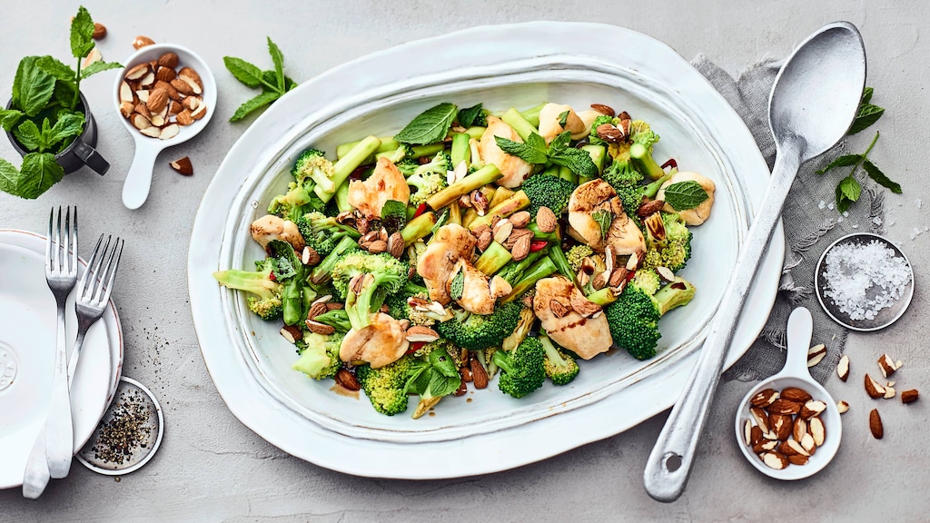 Wenn Sie auf der Suche nach einem frischen und leckeren Abendessen mit wenig Kohlenhydraten sind haben wir hier genau das Richtige: Brokkolisalat mit Hähnchenbrustfilet, Spargel und Mandeln.