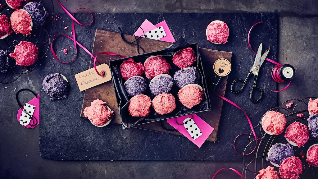 Klein, köstlich und mit einem Haps im Mund: Probieren Sie unsere bunten Mandel-Makronen aus Eiweiß, Puderzucker und Mandeln in 3erlei Farben.