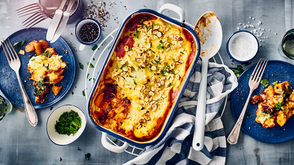 Püree nach Packungsangabe mit Salz, Margarine und Milch zubereiten. Käse untermischen. Püree über dem Gemüse verteilen und mit den gehobelten Haselnusskernen bestreuen. Im vorgeheizten Backofen bei 200 °C (Umluft: 180 °C) ca. 30 Minuten überbacken.