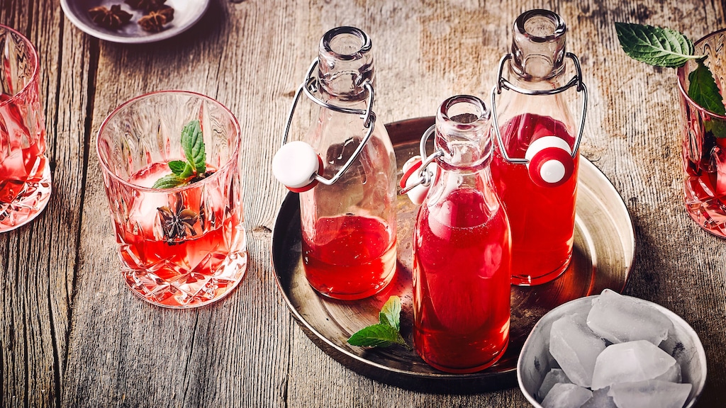 Die Johannisbeeren mit den Himbeeren, dem Sternanis, den Pfefferminzblättern und dem Kandiszucker in eine entsprechend große Flasche füllen.
