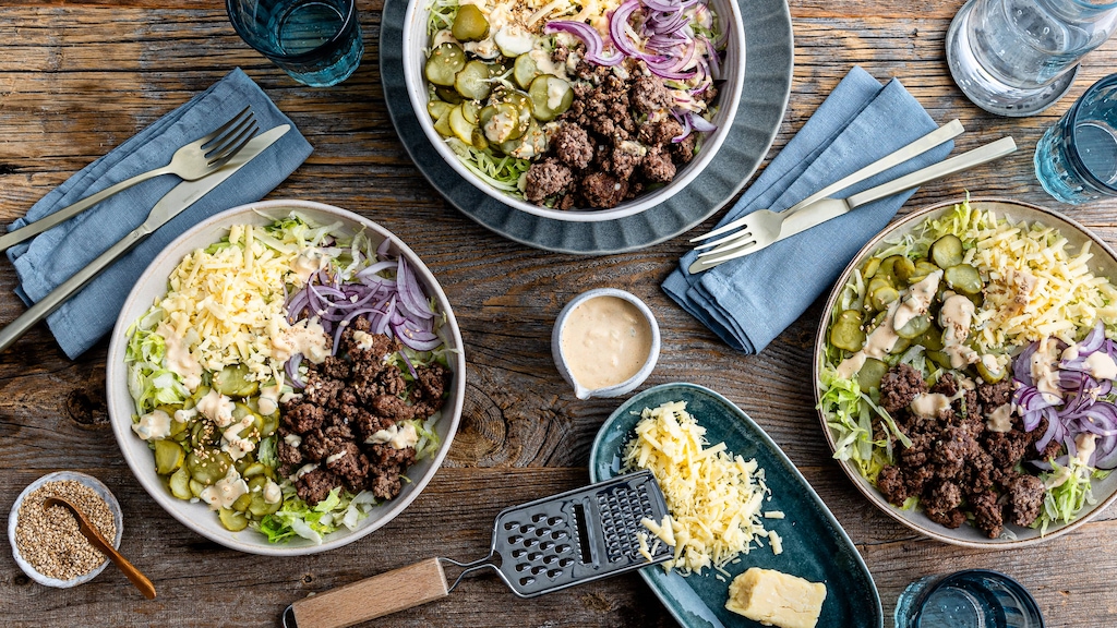In der Salatschüssel landen fein übereinander aufgeschichtet knackiger Eisbergsalat, Gewürzgurken, geriebener Cheddarkäse und natürlich Rinderhack – allerdings nicht als Pattie, sondern in groben Stücken. Wer auf Fleisch verzichten möchte, kann veganes Hack verwenden. Gekrönt wird das Ganze von einem Cheeseburger-Salat-Dressing, das wir aus Zutaten wie Knoblauch und Zwiebeln, Ketchup, Senf, Mayo und Gewürzen angerührt haben. Möchten Sie den Salat als Lunch mitnehmen, probieren Sie doch auch einmal unser Rezept für Burger-Salat im Glas.