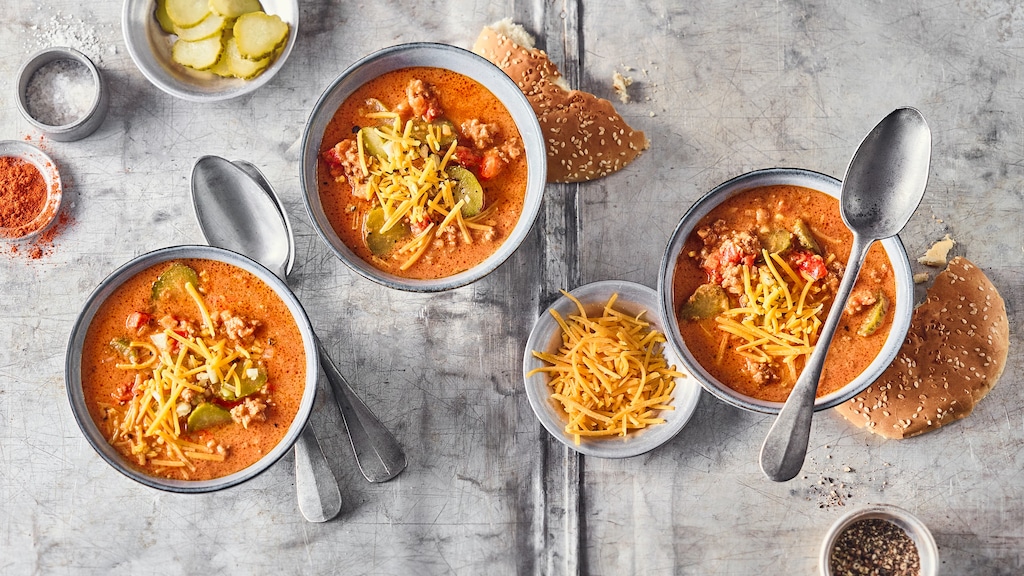 Unser Cheesburger-Suppe-Rezept zeigt: Die charakteristischen Zutaten des Cheeseburgers machen sich nicht nur zwischen zwei Brötchenhälften gut. Uns sind da außerdem noch ein paar weitere Varianten eingefallen, in denen wir das Quartett aus Hackfleisch, Gewürzgurken, Tomaten und Käse antreten lassen: Einen Cheeseburger-Auflauf, zum Beispiel. Oder die Cheeseburger-Pasta, die gleich zwei Lieblings-Gerichte zu einem herzhaften One-Pot-Gericht vereint. Diese Burger meets Nudeln – ein bisschen wie Weihnachten und Geburtstag an einem Tag! Und auch unser Cheeseburger-Salat bewirbt sich um einen Platz auf der Liste Ihrer neuen Lieblings-Rezepte: Hier richten wir die Grundzutaten low carb als Bowl an. Probieren Sie das Rezept gleich mal aus: Die Zubereitung dauert nur 35 Minuten!