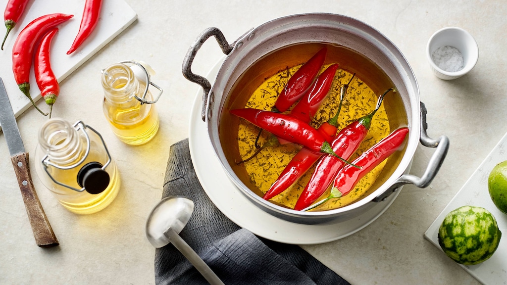 Ein paar Tropfen auf die selbst gemachte Pizza, etwas Schärfe für das Rührei, ein zusätzlicher Kick fürs Salatdressing: Chiliöl selber zu machen, eröffnet Ihnen nahezu unendliche Möglichkeiten, unterschiedliche Gerichte unkompliziert zu verfeinern – und unser Rezept erklärt Ihnen, wie es gelingt.