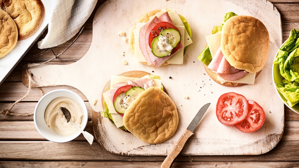 Inzwischen den Kopfsalat waschen und trocken schleudern. Tomate waschen, Strunk herausschneiden und in dünne Scheiben schneiden. Gurke waschen und in Scheiben schneiden. Vier Cloud Breads jeweils mit einem Salatblatt, Tomaten- und Gurkenscheiben sowie jeweils einer Scheibe Kochschinken und Emmentaler belegen. Mit einem Klecks Salat-Mayonnaise toppen. Den Deckel aufsetzen und servieren.
