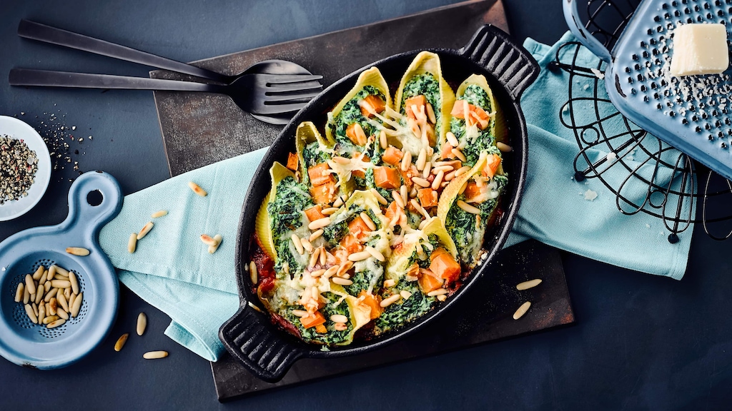 Die gehackten Tomaten in eine Auflaufform geben und die Conchiglioni mit der Öffnung nach oben darauf anrichten. Die Conchiglioni mit der Süßkartoffel-Spinat-Creme befüllen und mit geriebenem Parmesan bestreuen.