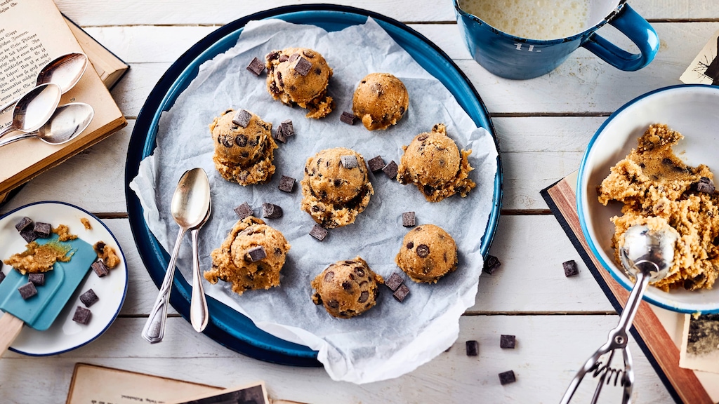 Natürlich dürfen Sie aus den Resten dann doch noch Plätzchen backen. Es wären dann feine Cookies ohne Ei. Denn rohe Eier zu essen, ist gesundheitlich nicht unbedenklich. Außerdem enthält unser Cookie-Dough-Rezept kein Backpulver oder andere Triebmittel, da diese unnötig wären und geschmacklich keinen Vorteil bieten. Neben Butter, Zucker, Milch und Mehl geben Sie Schokochunks und Schokoladenchips, wie Sie sie von den typischen Schokocookies kennen, mit in den Teig. Das Aroma dürfen Sie allerdings gerne variieren. Mögen Sie es karamellig? Fügen Sie doch klein gehackte Karamellbonbons dazu! Für den Extra-Kick Koffein geben Sie ein paar in der Küchenmaschine geschredderte Espresso-Bohnen hinein.