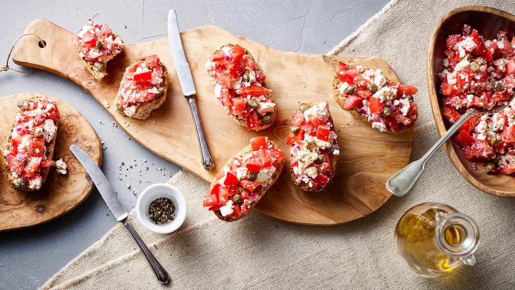 Zwieback auf eine Servierplatte geben, mit der Tomaten-Feta-Mischung toppen und servieren.