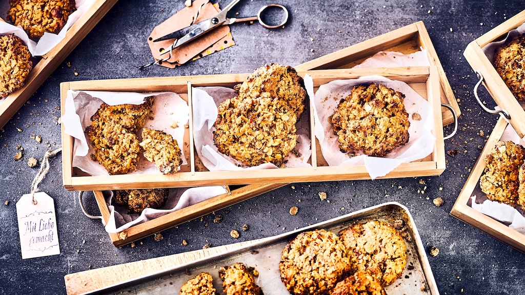 Mit unserem Cookie-Rezept bereiten Sie sich leckeres Gebäck mit getrockneten Datteln, Ahornsirup, Haferflocken und ganzen Haselnüssen zu!