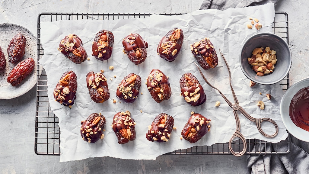 Datteln eilt ein hervorragender Ruf voraus: Im Nahen Osten, wo sie auch kulinarisch weitverbreitet sind, dienen sie etwa als Mittel bei Darmbeschwerden, Fieber oder Bronchitis. Zusätzlich stecken die kleinen Kernfrüchte voller Nährstoffe – und sind außerdem wunderbar süß. Diese Eigenschaft bringt Datteln wiederum häufig die Rolle als Zuckerersatz ein. Dank ihrer Vielfältigkeit lassen sie sich außerdem in zahlreichen Dattel-Rezepten einsetzen. Oder Sie nutzen sie ganz einfach, um eine leckere Süßigkeit zu kreieren. Wollen Sie unsere Datteln mit Schokolade überzogen selber machen, brauchen Sie zusätzlich lediglich Mandelmus und Nüsse. Setzen Sie zudem auf entkernte Früchte, können Sie 20 Minuten nach Arbeitsbeginn auch schon die ersten Schoko-Datteln genießen.