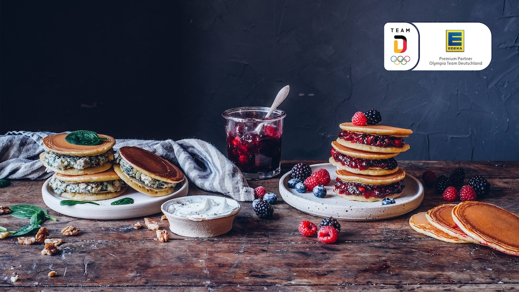 Vier Pfannkuchen mit jeweils einem gehäuften Esslöffel der süßen Füllung und vier Pfannkuchen mit jeweils einem gehäuften Esslöffel der herzhaften Füllung versehen und gleichmäßig verstreichen. Die übrigen Pfannkuchen auflegen und servieren.