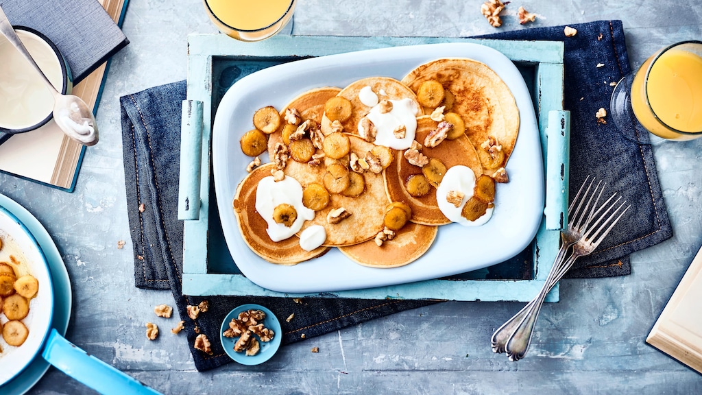 Die Bananen schälen und in Scheiben schneiden. Die Butter in einer beschichteten Pfanne erhitzen und die Bananenscheiben darin leicht goldbraun braten. Die Eierkuchen mit den Bananen auf Tellern anrichten, je einen Klecks Joghurt darauf geben und mit Walnüssen bestreut servieren.