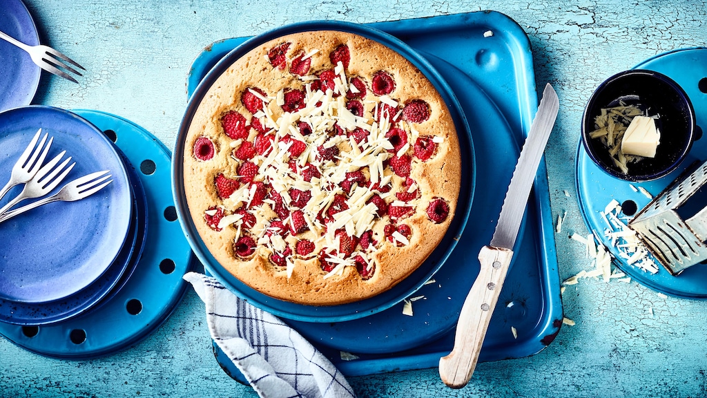 Die Himbeeren in die Mitte des Rührteiges geben und den Kuchen für 40-50 Minuten backen. Gegen Ende der Backzeit mit einem Holzstiel oder Zahnstocher in die Mitte des Teiges stechen, um zu prüfen, ob der Teig gar ist.