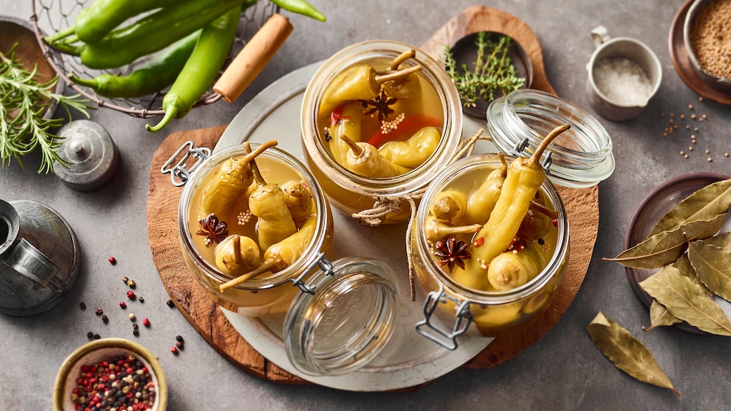 Es gibt verschiedene Möglichkeiten, frische Peperoni, auch Pfefferoni oder Gewürzpaprika genannt, haltbar zu machen. Eine davon: Peperoni in Essig einlegen. Das funktioniert ähnlich wie bei scharfen Einlegegurken, eingelegten grüne Tomaten oder Pickled Red Onions: Essig vernichtet Keime und Mikroorganismen, abgefüllt in saubere Einmachgläser, wie beim Bohnen einkochen, verlängert sich die Haltbarkeit von Gemüse. Peperoni selbst einlegen ist wirklich simpel: Die Schoten entkernen, mehrmals einstechen und in einem Sud aus Essig und Gewürzen aufkochen. Das eingelegte Peperoni-Rezept können Sie ruhig variieren und statt Zimt, Sternanis und Senfsamen Ihre Lieblingsgewürze verwenden. Auch Knoblauch oder Zwiebeln passen gut dazu. Als Essig eignet sich Weinessig oder der fruchtigere Apfelessig. Grüne Peperoni sind übrigens knackiger und herber als rote Peperoni. Wenn Sie grüne Peperoni einlegen, verlieren die Schoten, ebenso wie die roten Varianten, an Schärfe. Scharfe Peperoni einlegen lohnt sich wiederum für alle, die es milder mögen. Und lassen sich eingelegte Peperoni einfrieren? Hier lautet die Antwort: Das ist nicht sinnvoll. Denn in einem gut verschließbaren Einmachglas halten die Peperoni mehrere Monate. Übrigens genauso lang wie unsere eingelegten Radieschen. Das gilt auch für andere Lebensmittel, die Sie mit unseren Rezepten fermentieren.