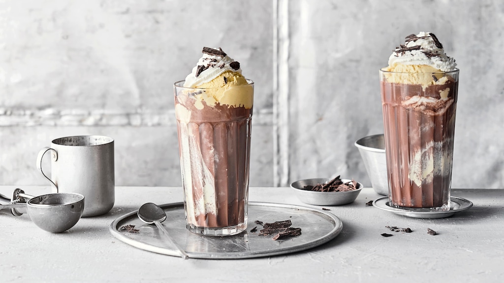 Je eine große Kugel Vanilleeis in ein hohes Glas geben und mit der Schokoladenmilch übergießen.