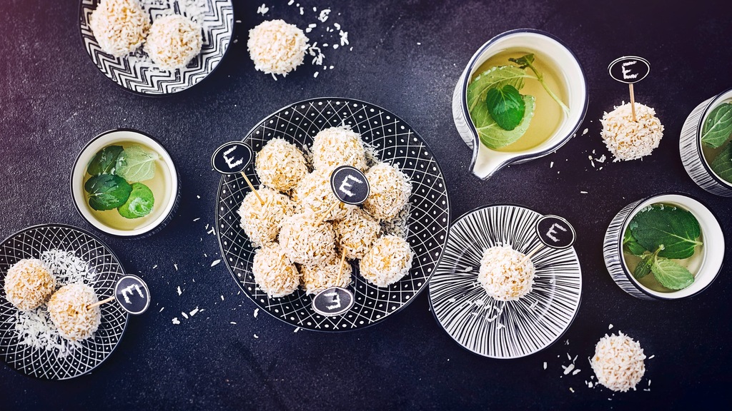 Die Basis der Energiebällchen bilden Trockenfrüchte wie Datteln, Aprikosen oder Rosinen, die püriert werden. Nach individueller Vorliebe fügt man Nüsse, Kerne, Samen, Flocken, Gewürze, Superfoods und andere Zutaten hinzu. (Bei der Zugabe von frischen Früchten müssen Sie die Energiekugeln im Kühlschrank lagern.) In unserem Energiekugeln-Rezept verwenden wir in Orangensaft eingelegte Rosinen. Die Zutaten werden vermengt und zu kleinen Kugeln geformt, die oft noch beispielsweise in Kokosflocken gewälzt werden. Bei der Energiekugeln-Variation sind es pürierte Trockenpflaumen, die mit Früchtemüsli, Honig und Zitronensaft vermengt und in gemahlenen Haselnüssen gewendet werden. Beim nächsten Heißhunger stehen die Energy Balls dann bereit. Probieren Sie es aus! Oder Sie bereiten einen herzhaft-süßen Snack zu, der den Heißhunger und die Lust auf Süßes gleichermaßen stillt. Wie wäre es zum Beispiel mit unserem Gefüllte-Datteln-Rezept mit Ziegenfrischkäse und karamellisierten Walnüssen? Und wenn Sie doch mal Lust auf ein ganz klassisches Naschwerk haben, zeigen wir Ihnen mit unseren Rezepten, wie Sie Spekulatius-Kugeln zubereiten, Bounty selbst herstellen, Nougatkugeln backen oder Raffaello selber machen.