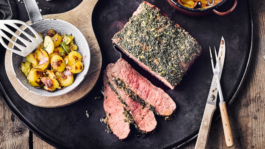 Bereiten Sie mit unserem Entrecôte-Braten-Rezept ein saftiges Festmahl aus dem Ofen zu und reichen Sie dazu Bratkartoffeln und Paprikagemüse. Eine feine Kräuterkruste aus Thymian, Salbei und Rosmarin rundet den Geschmack ab.
