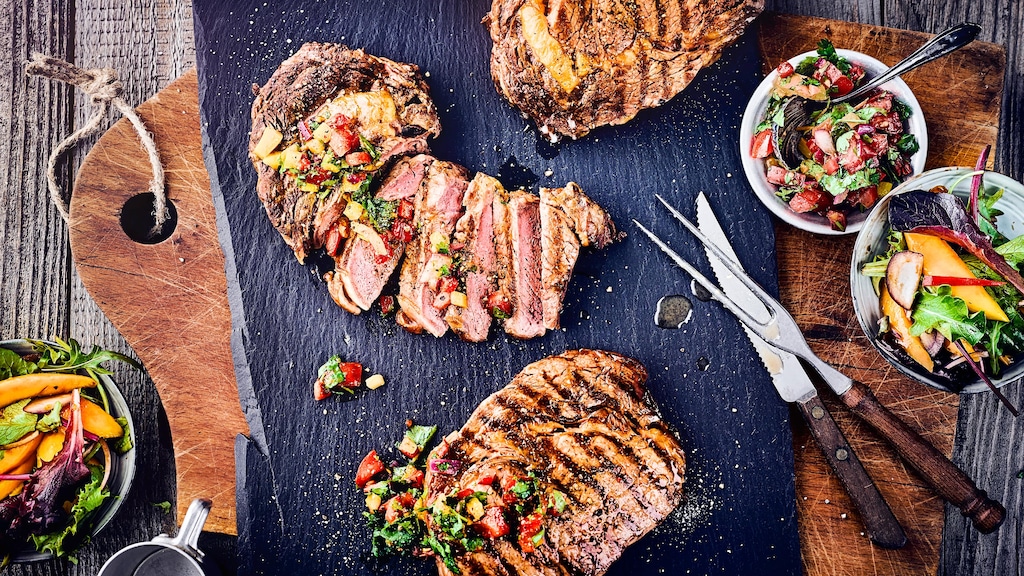 Perfektes Grillfleisch mit einer fruchtig-scharfen Beilage: Entrecôte mit Mangosalat.