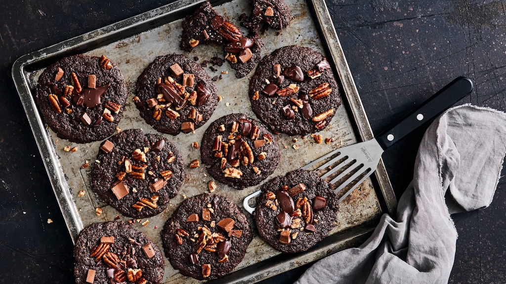 Backofen auf 180 Grad (Umluft 160) vorheizen. Vollmilchschokolade, restliche Zartbitterschokolade und Pekannnüsse grob hacken. Von dem Teig mit einem leicht bemehlten Eisportionierer (alternativ Esslöffel) Stücke abstechen und mit bemehlten Händen zügig zu Kugeln formen. Jeweils sechs auf ein mit Backpapier belegtes Backblech geben.