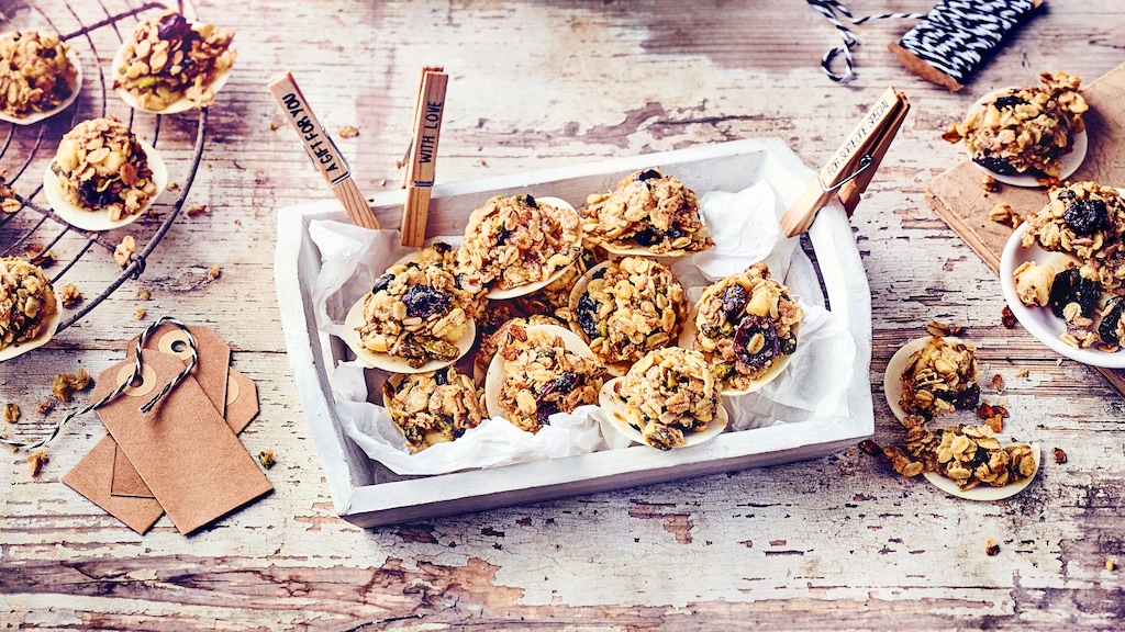 Ganz ohne Extra-Zucker – und ganz ohne Backen – kommen unsere selbst gemachten Fruchtriegel aus. Aber zurück zu den Müsli-Keksen: Die kleinen Leckerbissen werden ganz ohne Mehl gebacken, sie bestehen aus Vier-Korn-Flocken, gehackten Macadamia-Nüssen und Pistazien. Eier lassen die Flockenmischung zusammenhalten. Löffelweise auf ein Backblech gegeben, werden sie im Ofen binnen einer Viertelstunde goldbraun (beides haben sie mit unseren Macadamia-Cookies mit weißer Schokolade gemein). Auf diese Weise können Sie übrigens auch einfach Knuspermüsli selber machen. Eine echte Sünde aus Toffifee, Butter, Mehl und Zucker sind hingegen unsere Toffifee-Kekse.
