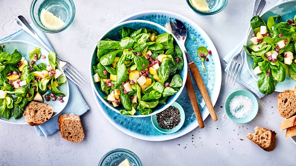 Schneller Snack: Frischer Feldsalat mit gebratenem Speck, saftigen Birnen und würzigem Balsamico-Senf-Dressing – in nur 20 Minuten servierbereit!