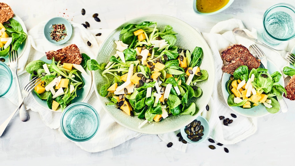 Probieren Sie unseren frischen Feldsalat mit fruchtiger Mango und würzigen Ziegenkäse. Dazu leckeres Vollkornbrot. Ein herrliches Gericht – auch für Vegetarier!