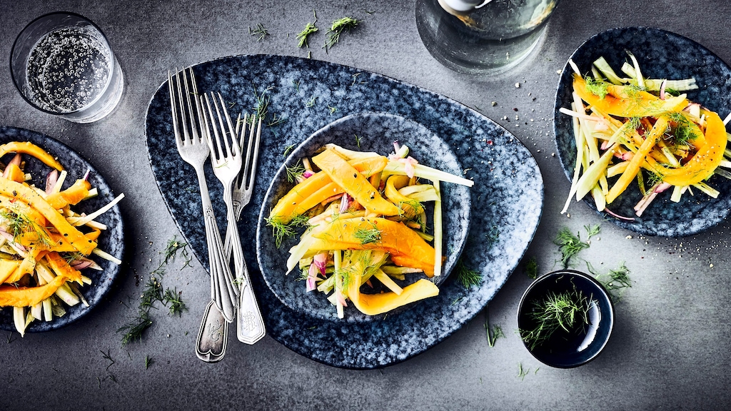 In zehn Minuten fertig: Unser fruchtiger Salat aus Fenchel-Zwiebel-Streifen mit Balsamico-Granatapfel-Dressing auf Mangospalten – ein Genuss!